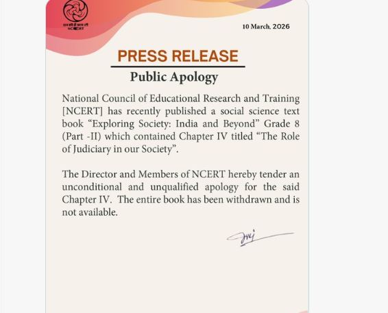 ଏନସିଇଆରଟି ଏକ୍ସ ରେ ଟ୍ୱିଟ୍ କରିଛି ଯେ ଏହା ସମ୍ପ୍ରତି ଏକ ସାମାଜିକ ବିଜ୍ଞାନ ପାଠ୍ୟପୁସ୍ତକ, “The Discovery of Society: India and Beyond” ଶ୍ରେଣୀ 8 (ଭାଗ II) ପ୍ରକାଶ କରିଥିଲା। ଏଥିରେ “The Role of the Judiciary in Our Society” ଶୀର୍ଷକ ଅଧ୍ୟାୟ IV ଅନ୍ତର୍ଭୁକ୍ତ ଥିଲା। ଏନସିଇଆରଟିର ନିର୍ଦ୍ଦେଶକ ଏବଂ ସଦସ୍ୟମାନେ ଉକ୍ତ ଅଧ୍ୟାୟ IV ପାଇଁ ନିଃସର୍ତ୍ତ ଏବଂ ସମ୍ପୂର୍ଣ୍ଣ କ୍ଷମା ପ୍ରାର୍ଥନା କରୁଛନ୍ତି। ସମ୍ପୂର୍ଣ୍ଣ ପୁସ୍ତକଟି ପ୍ରତ୍ୟାହାର କରାଯାଇଛି। ଏବଂ ଆଉ ଉପଲବ୍ଧ ନାହିଁ। ବିବାଦୀୟ ଅଧ୍ୟାୟକୁ ନେଇ ସୁପ୍ରିମକୋର୍ଟ କ୍ଷୁବ୍ଧ ହୋଇଥିବାବେଳେ ଏଥିପାଇଁ କିଏ ଉତ୍ତରଦାୟୀ ବୋଲି ଜଣାଇବାକୁ ପ୍ରଧାନମନ୍ତ୍ରୀ ମୋଦୀ କହିଥିଲେ।