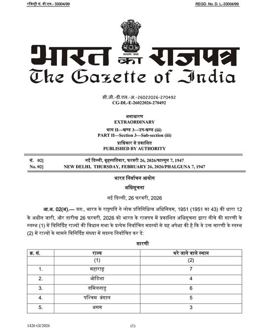 ଭୁବନେଶ୍ୱର : ରାଜ୍ୟସଭା ନିର୍ବାଚନ ପାଇଁ ବିଧିବଦ୍ଧ ବିଜ୍ଞପ୍ତି ପ୍ରକାଶ ପାଇଲା । ମାର୍ଚ୍ଚ ୧୬ ତାରିଖରେ ହେବ ରାଜ୍ୟସଭା ନିର୍ବାଚନ । ୧୦ ରାଜ୍ୟର ୩୭ ରାଜ୍ୟସଭା ଆସନ ପାଇଁ ନିର୍ବାଚନ ହେବାକୁ ଥିବାବେଳେ ଓଡ଼ିଶାର ୪ ଆସନ ପାଇଁ ହେବ ନିର୍ବାଚନ । ମାର୍ଚ୍ଚ ୫ ତାରିଖରେ ନାମାଙ୍କନ ଦାଖଲର ଶେଷ ତାରିଖ, ୬ ତାରିଖରେ ଯାଞ୍ଚ। । ମାର୍ଚ୍ଚ ୯ ରେ ପ୍ରାର୍ଥୀପତ୍ର ପ୍ରତ୍ୟାହାରର ଶେଷ ତାରିଖ ।ସେହିପରି ମାର୍ଚ୍ଚ ୧୬ ତାରିଖ ସକାଳ ୯ରୁ ଅପରାହ୍ଣ ୪ ଯାଏଁ ଭୋଟ୍ ଗ୍ରହଣ, ଅପରାହ୍ଣରେ ହେବ ଭୋଟ୍ ଗଣତି ।