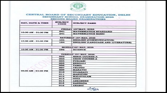 ଭୁବନେଶ୍ୱର : ପ୍ରକାଶ ପାଇଲା CBSE ଦଶମ ଶ୍ରେଣୀ ୨ୟ ବୋର୍ଡ଼ ପରୀକ୍ଷା ତାରିଖ । ମେ ୧୫ରୁ ୨୧ ତାରିଖ ଯାଏ ଚାଲିବ ଏହି ପରୀକ୍ଷା । ସକାଳ ୧୦:୩୦ ରୁ ୧:୩୦ ଯାଏ ଚାଲିବ ପରୀକ୍ଷା । ଚଳିତ ବର୍ଷ ପ୍ରଥମ ଥର CBSE କରିଛି ୨ୟ ବୋର୍ଡ଼ ପରୀକ୍ଷା ନିଷ୍ପତ୍ତି । ଛାତ୍ରଛାତ୍ରୀ ଅଳ୍ପ ମାର୍କ ରଖିଥିବା ବିଷୟରେ ରିପିଟ ପରୀକ୍ଷା ଦେଇ ପାରିବେ । ଏହି ସୁଯୋଗ ଛାତ୍ରଛାତ୍ରୀଙ୍କୁ 3 ଟି ବିଷୟ ପାଇଁ ସୁଯୋଗ ମିଳିବ । ସେଥି ମଧ୍ୟରୁ ଗୋଟିଏ ଲାଙ୍ଗୁଏଜ ଓ ଦୁଇଟି ଅନ୍ୟ ବିଷୟ ଅନ୍ତର୍ଭୁକ୍ତ ।